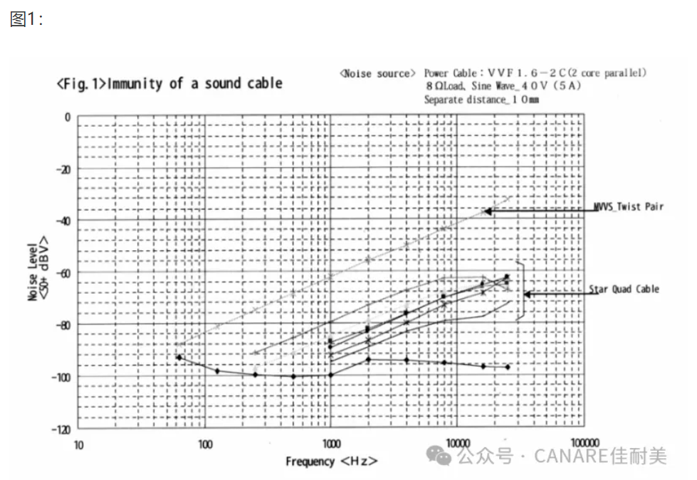 一般来说,强电系统应该距离音频缆6米以上,如果能够使用使用钢板(铁板)作为屏蔽的话,距离可以缩短到1.43米。从图1中可以看出,星绞电缆对电磁干扰的抵抗性更强,在这种情况下,如果不能铺设金属线槽对音频电缆进行屏蔽的话,就可以使用星绞电缆以达到最大程度上抑制电磁干扰的目标。