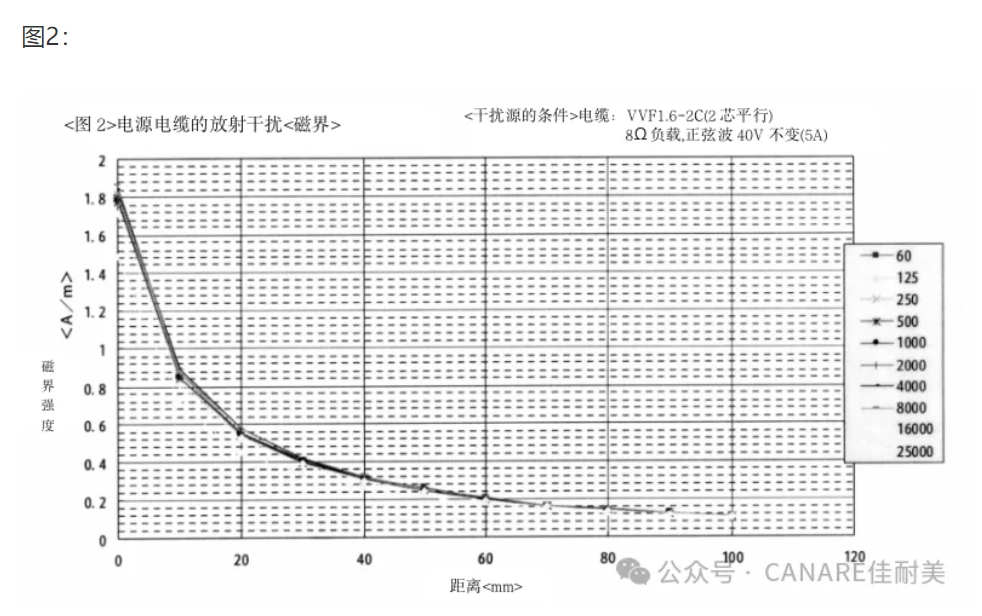 首先要了解变压器辐射的电磁辐射泄露边界(磁界),需要用仪表测量磁界数据,再根据所获得的数据,决定将其控制在10Gauss(0.8A/m)以下的距离。本公司编制了0.8A/m的干扰环境图(图2),可以通过所测定的音响电缆的抗干扰性(图1)查出变压器所辐射的电源频率对音响电缆的影响程度。